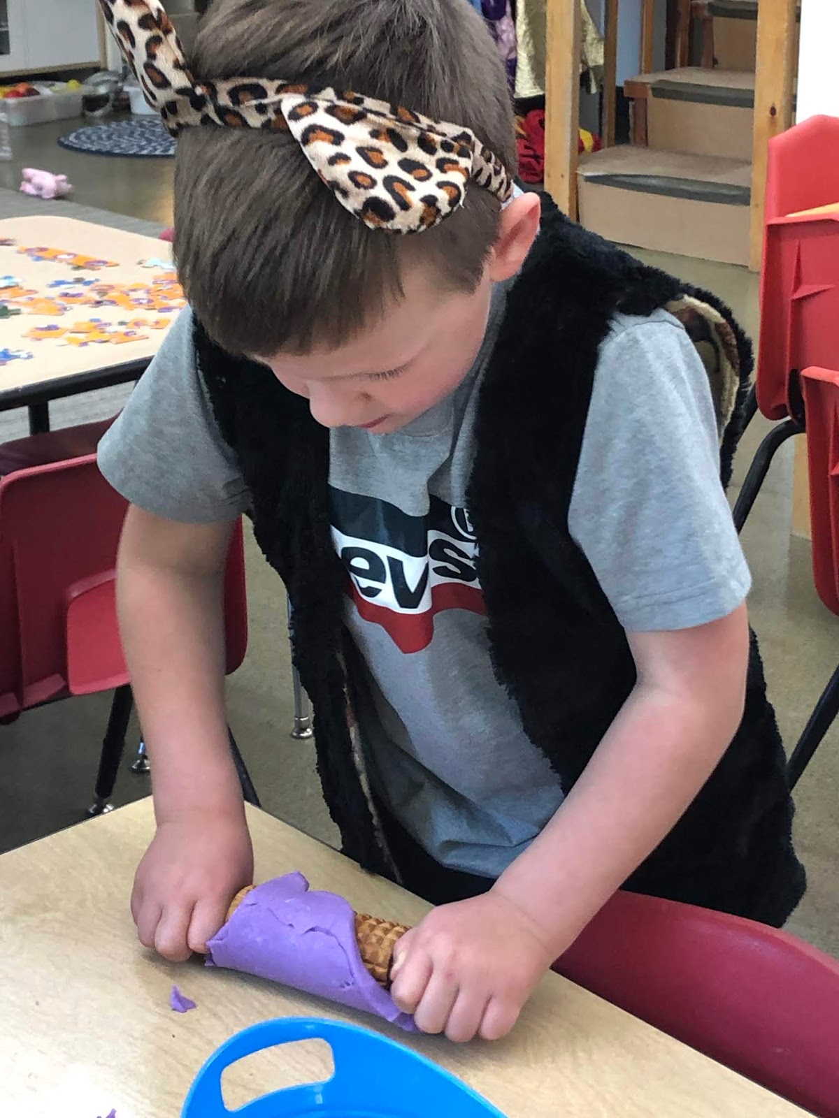 At the play dough table they squeezed, rolled and baked.