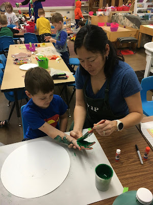 On Friday the kids learned how to make paper chains. They made a HUGE collaborative paper chain that we have hanging in class.