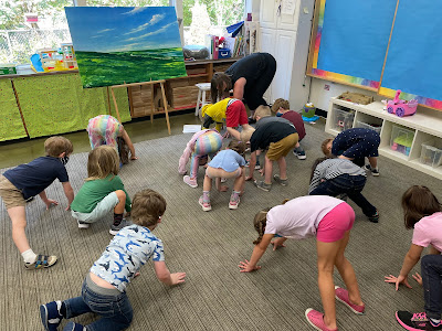After play time we all met on the carpet for some stories, songs and a dinosaur yoga. The dinosaur poses we did were Stegosaurus, Diplodocus, Ankylosaurus, Brachiosaurus and Spinosaurus. See if your camper can show any of them to you!